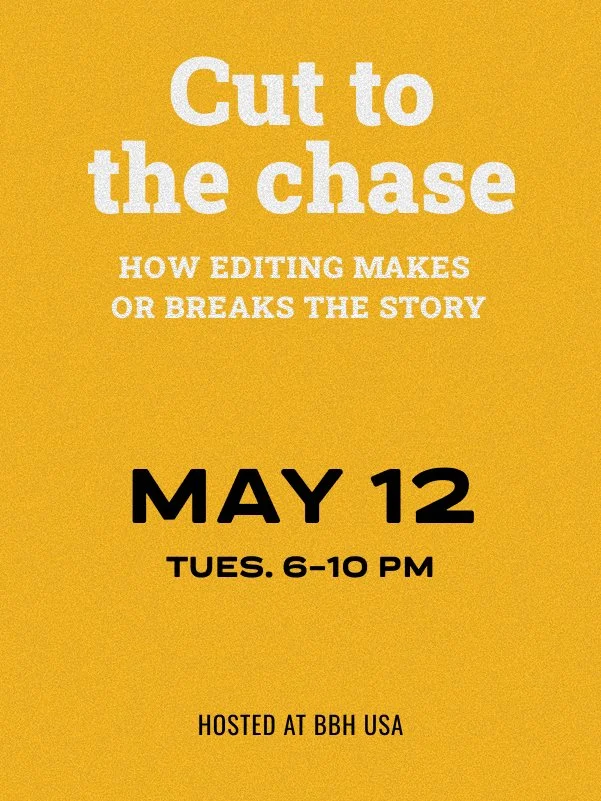 Our next IRL PrePros event will be on Tuesday, May 12 and hosted at BBH USA, 375 Hudson Street, NY, NY. Cut to the chase, how editing makes or breaks the story.